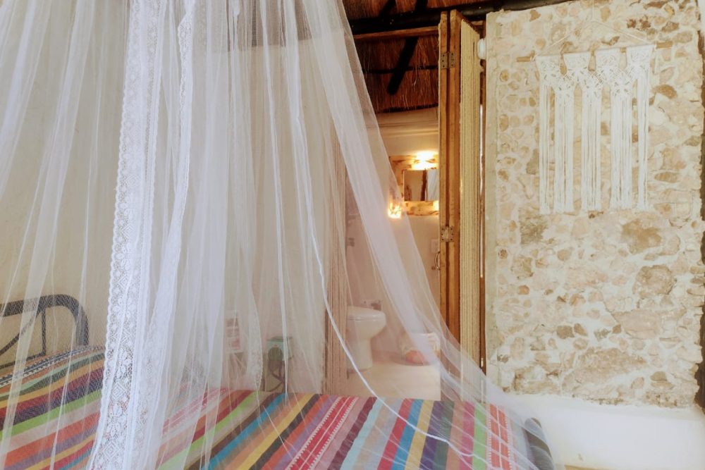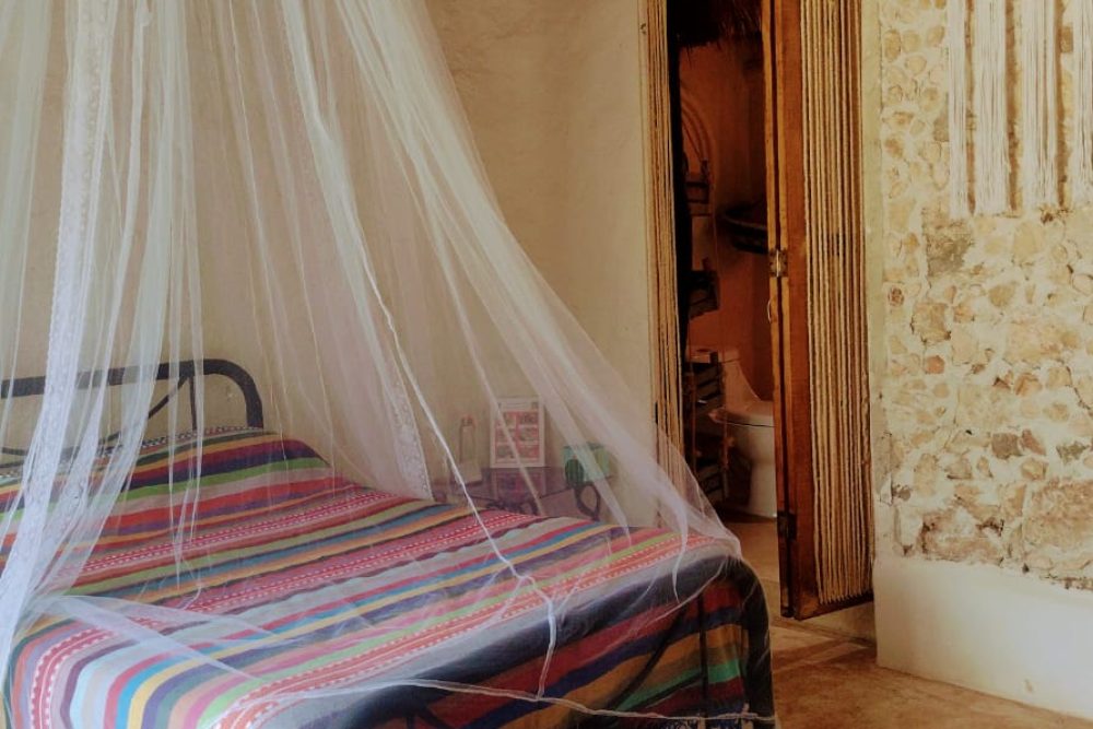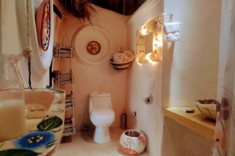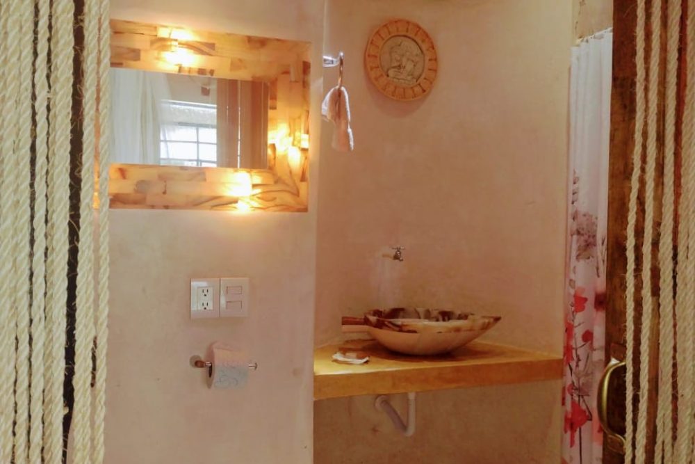 Casa Maya Del Toloque Coronado es una habitación rodeada de vegetación. Podrás observar un árbol de aguacate yucateco y una ceiba mientras tomas una rica ducha. El techo es 1,5 más alto que las paredes, por lo que tendrás una sensación de mucho espacio. La habitación fue nombrada Del Toloque Coronado ya que durante su construcción encontramos en varias ocasiones un toloque coronado en la lámpara del baño.